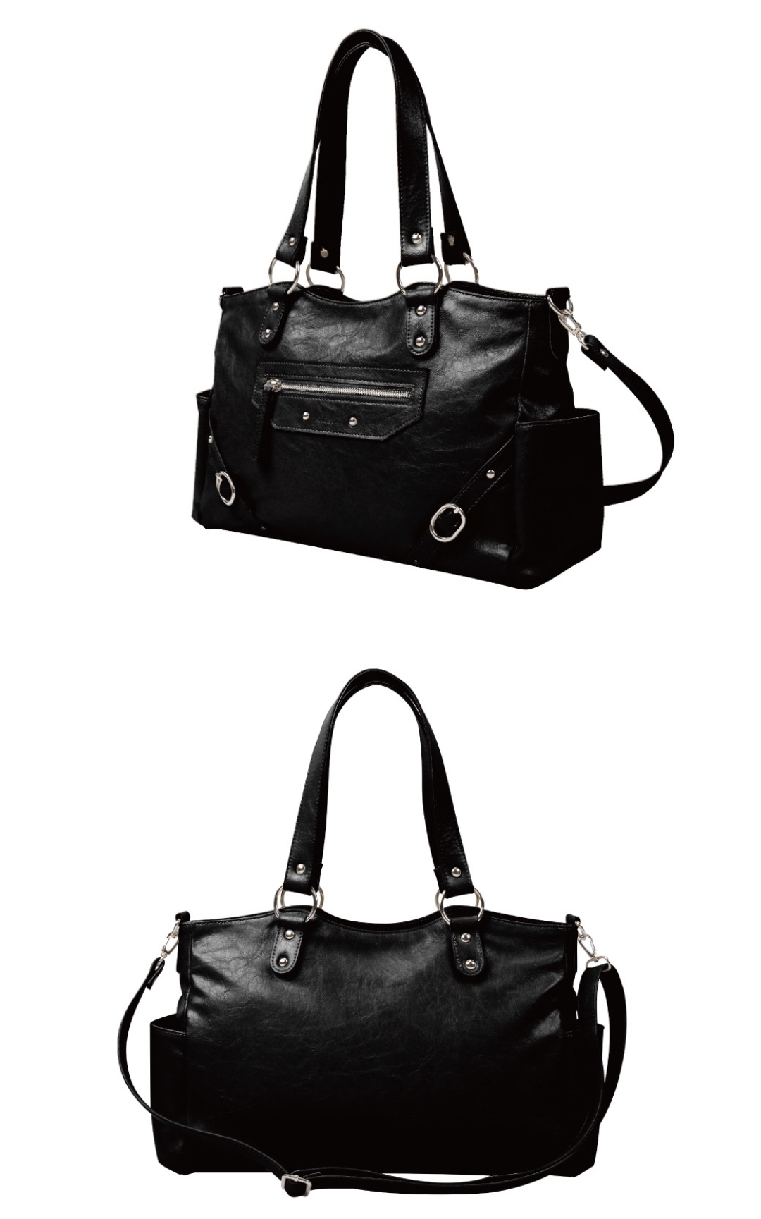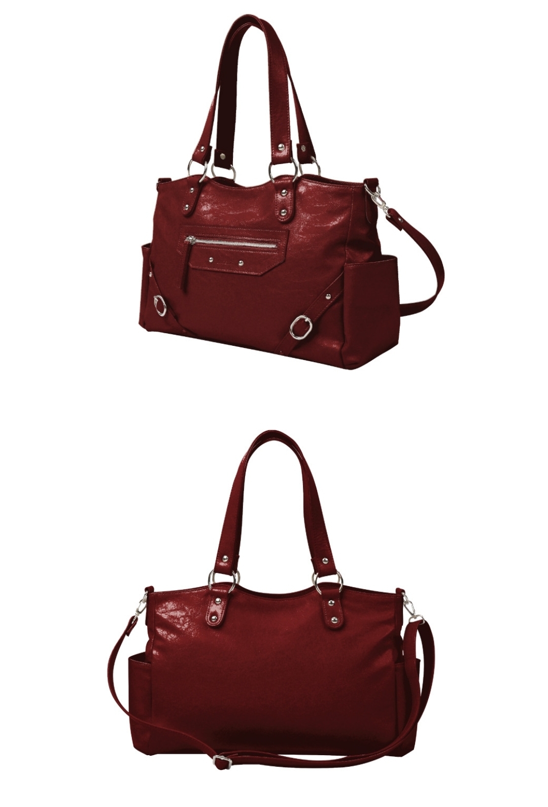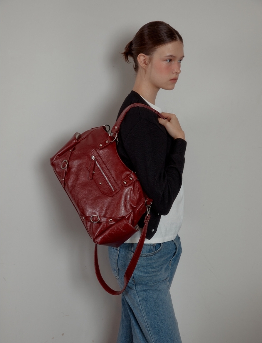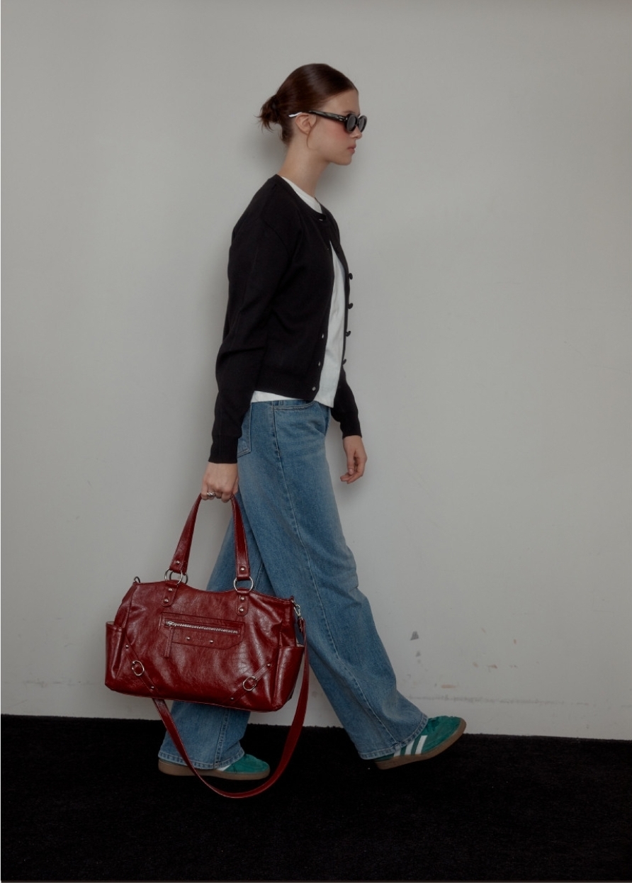 融合銀色鉚釘+大Ring設計 黑/紅/象牙白3️⃣色 光澤感皮革包~型格十足! 大容量設計 + 兩用揹法,實用與型格並重💯 Size:37.2×16.5×9.5cm 帶長:64-110cm